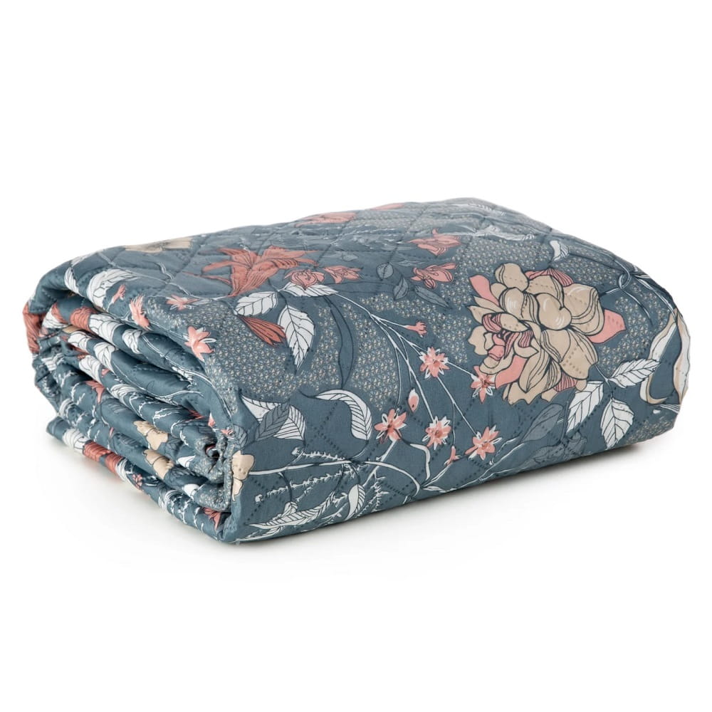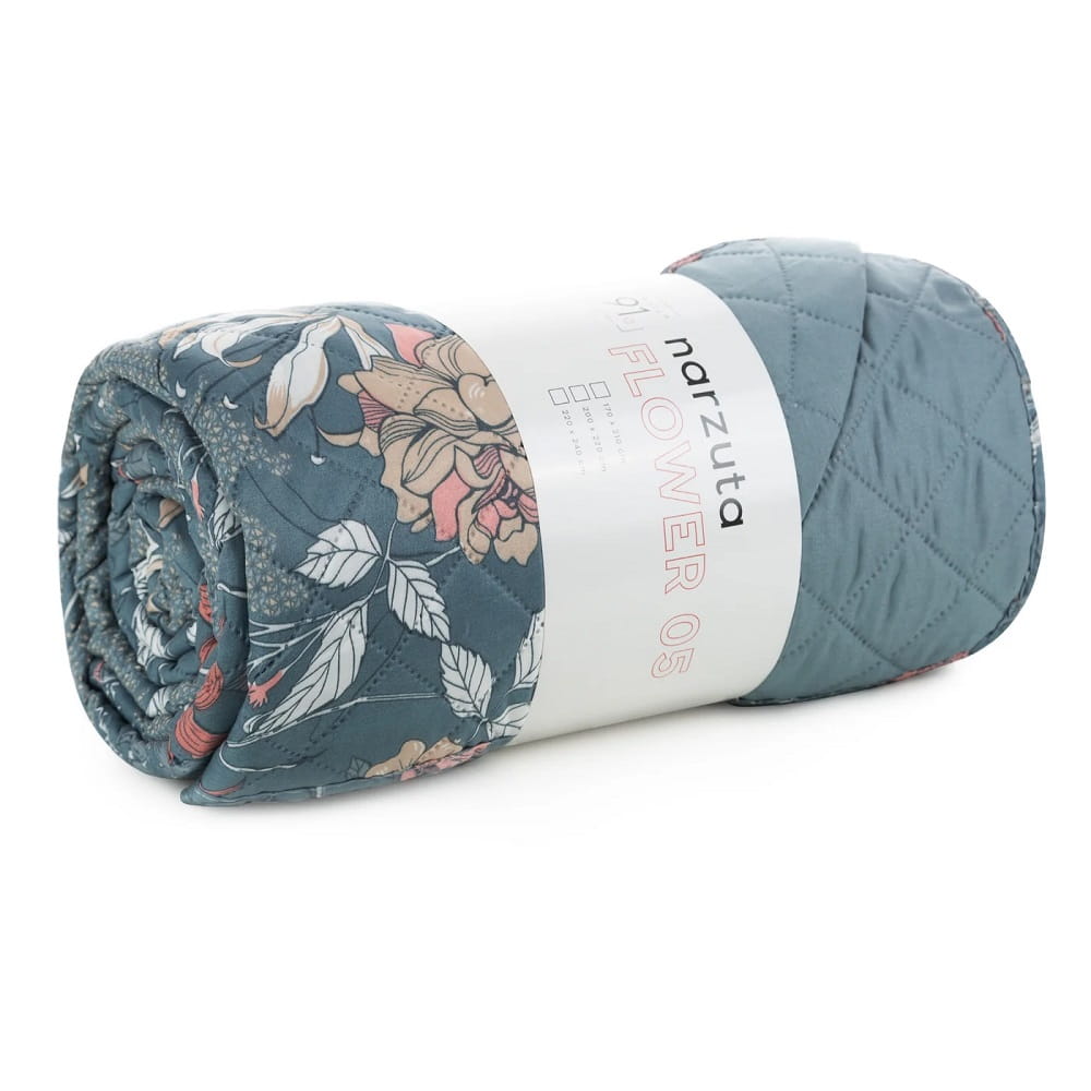 Narzuta 170x210 z kolekcji Flower wnosi do wnętrza letnią świeżość. Druga strona w gładkim odcieniu tworzy niezapomniany kontrast kolorystyczny. Intensywny wzór bogatych roślin i kwiatów wyróżni się na tle wnętrza, tworząc intrygującą kompozycję, która znakomicie sprawdzi się w romantycznych sypialniach. Rośliny wnoszą do pomieszczeń wiele radości oraz estetycznej harmonii. Warstwa elastycznego wypełnienia między dwoma tkaninami, sprawia, że narzuta miękko i estetycznie otula łóżko. Nowoczesna, bezszwowa metoda pikowania, zwiększa wytrzymałość materiału, zapewniając narzucie dłuższą trwałość. Urządź komfortowo swoje mieszkanie i odpoczywaj w pięknych pomieszczeniach. Wybieraj spośród dostępnych składników kolekcji i ciesz się wyjątkową oprawą sypialni.