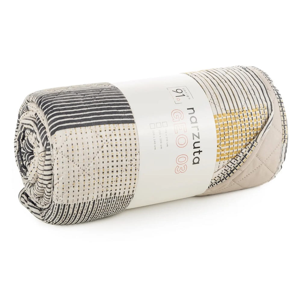 Narzuta dekoracyjna wnosi do wnętrza letnią świeżość. Druga strona w gładkim odcieniu tworzy niezapomniany kontrast kolorystyczny. Intensywny wzór figur wyróżni się na tle wnętrza, tworząc intrygującą kompozycję, która znakomicie sprawdzi się w nowoczesnych sypialniach. Geometryczne wzory wnoszą do pomieszczeń wiele radości oraz estetycznej harmonii. Warstwa elastycznego wypełnienia między dwoma tkaninami, sprawia, że narzuta miękko i estetycznie otula łóżko. Nowoczesna, bezszwowa metoda pikowania, zwiększa wytrzymałość materiału, zapewniając narzucie dłuższą trwałość. Urządź komfortowo swoje mieszkanie i odpoczywaj w pięknych pomieszczeniach. Wybieraj spośród dostępnych składników kolekcji i ciesz się wyjątkową oprawą sypialni.