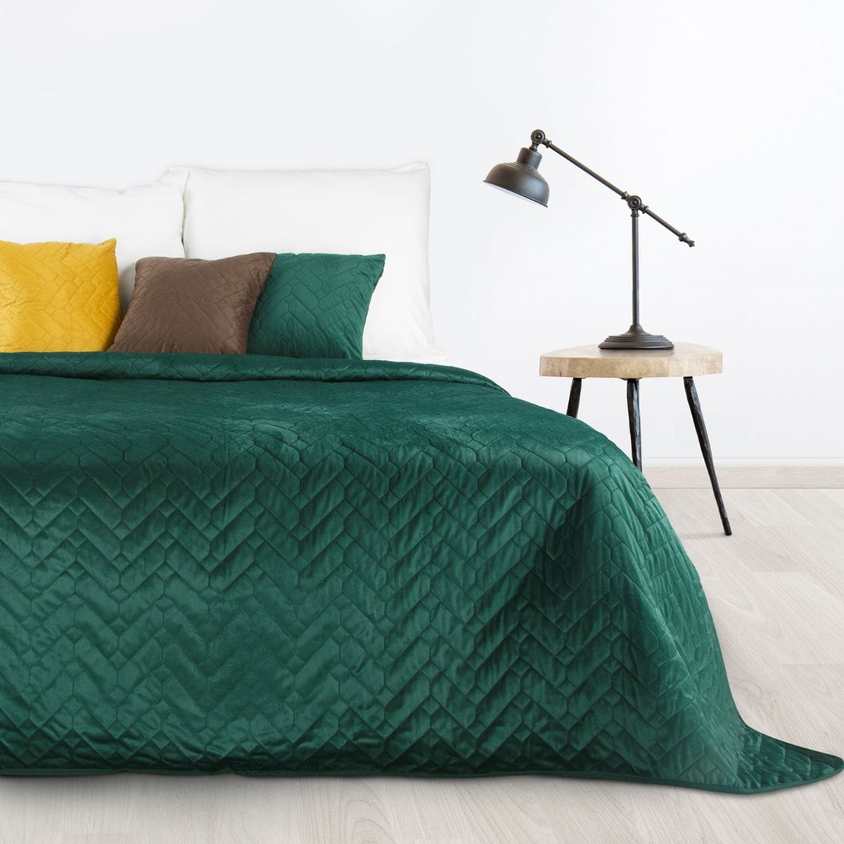 Narzuta Luiz 170x210 Ciemna zieleń pasuje do wysroju wielu wnętrz. Wykonana z miękkiego i miłego w dotyku materiału zdobionego pikowaniem. Wierzchnia strona narzuty wykonana jest z miękkiego welurowego materiału, natomiast spód, z gładkiej matowej mikrofibry, dzięki której narzuta nie zsuwa się z pościeli. Idealna na prezent.